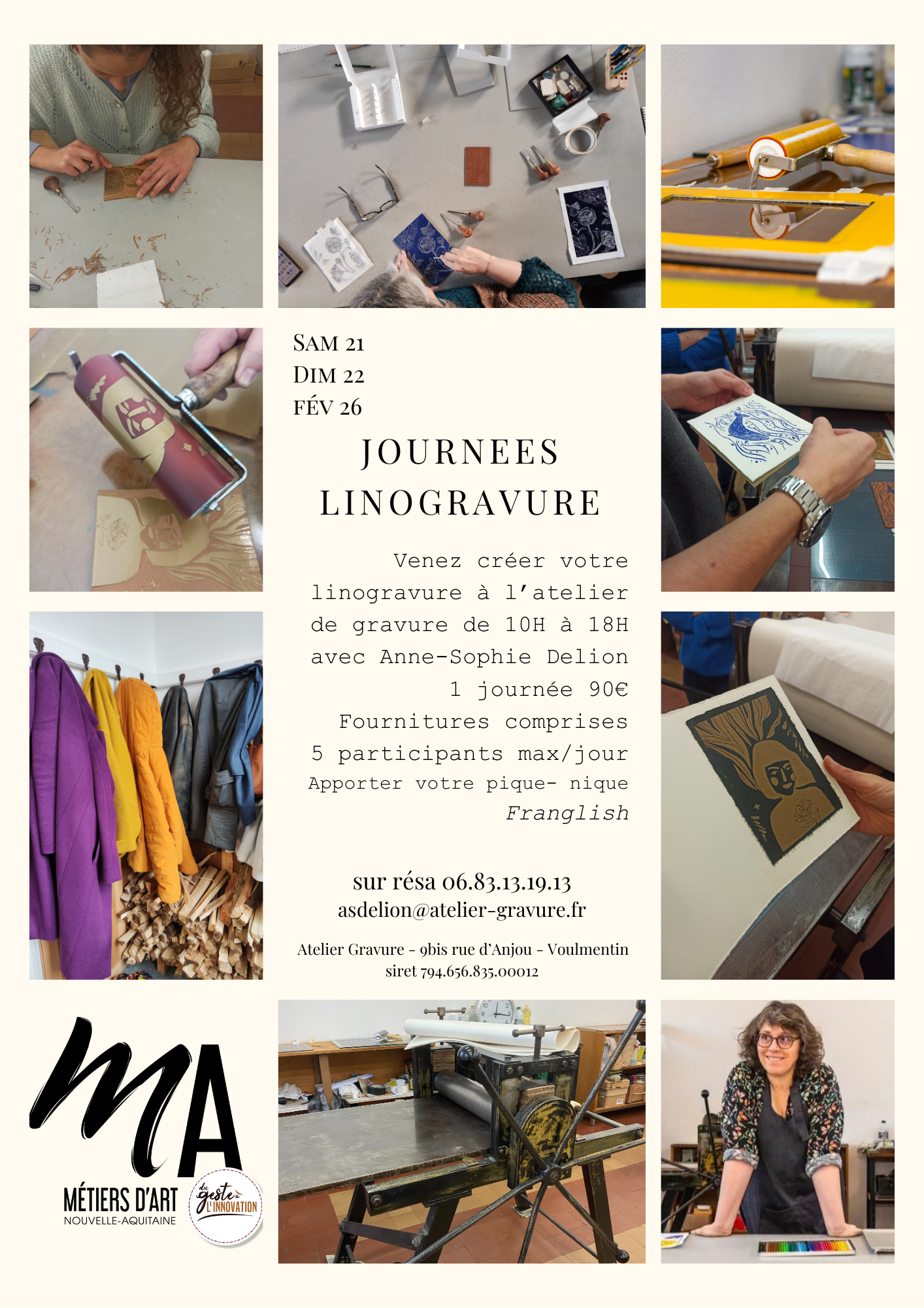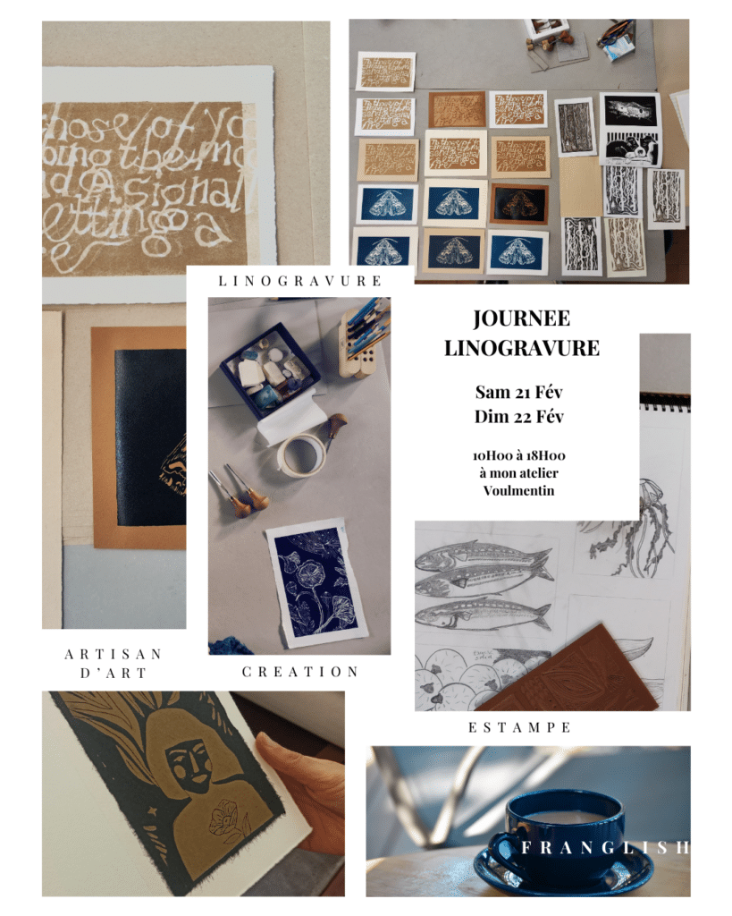 Et voici les dates des prochaines Journées Linogravure à mon atelier (Voulmentin, à 15 min de Bressuire). La formule n’a pas changé parce qu’elle me convient et qu’apparemment à vous aussi 🙂 Alors venez Sam 21 ou Dim 22 février de 10H à 18H, avec votre idée de gravure ou pas, votre repas et c’est tout !! Vous graverez au coeur d’un petit groupe de 5 participants pour découvrir ou redécouvrir la gravure (linogravure). Vous profiterez de mon appétit pour le matériel de qualité professionnelle, le papier d’art, la presse qui grogne, le vocabulaire technique, l’envie de vous rencontrer (franglish spoken à peu près) et tant qu’à faire la possibilité de passer un bon moment 🙂 Uniquement sur réservation, 90€ la journée (fournitures comprises) #metierdart #workshop #gravure #linogravure #linoprint #bressuire #atelierdegravure #diy #stagelinogravure